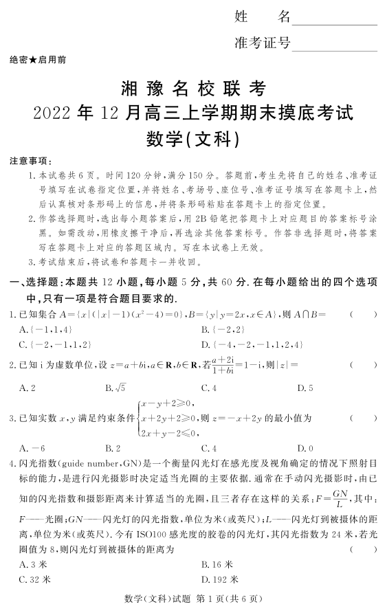 高三数学(文)--河南省湘豫名校联考2023高三上学期12月期末摸底考试