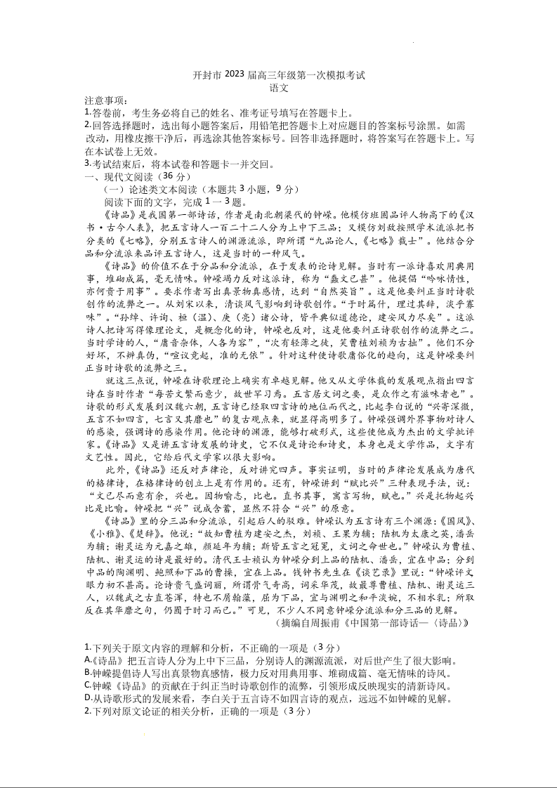 高三语文+答案--河南省开封市2023高三上学期一模考试