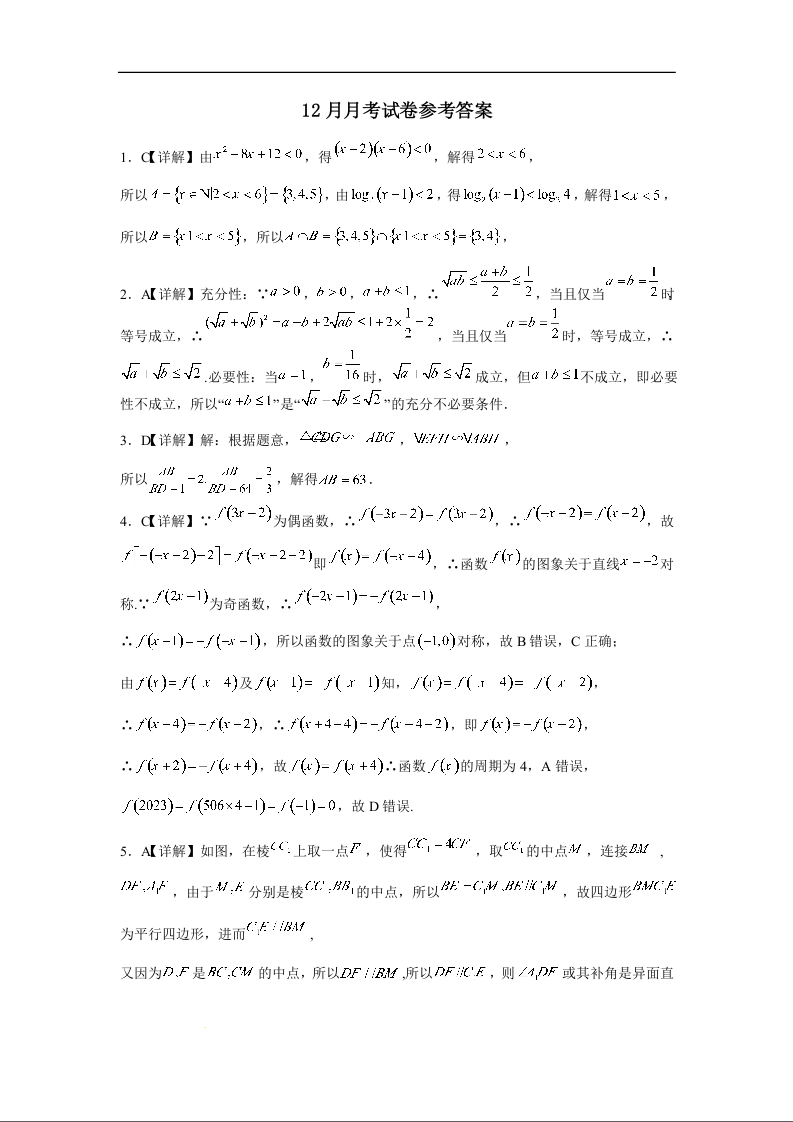 高三文科数学答案--河南省顶级名校2023高三上学期12月摸底考试