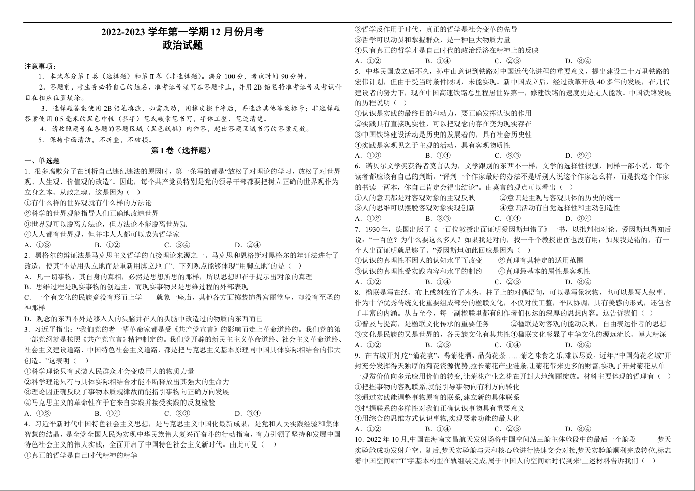 高三政治--河南省顶级名校2023高三上学期12月摸底考试