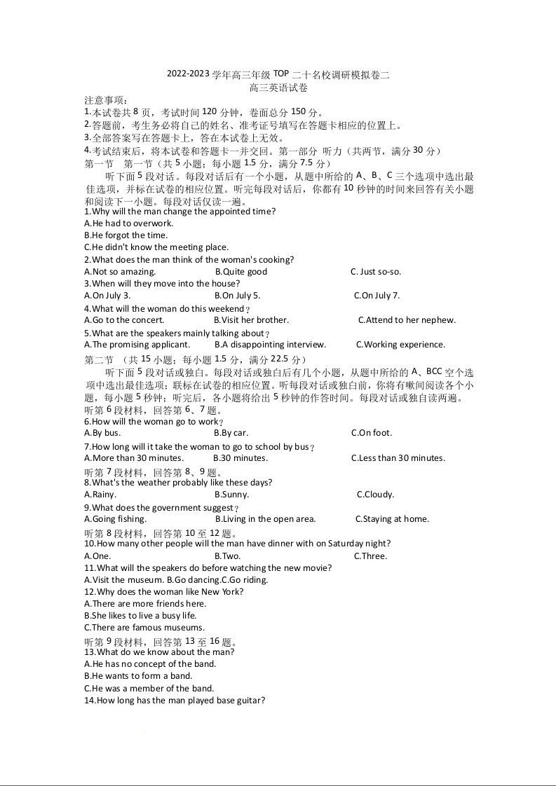 高三英语+答案-河南省TOP二十名校2022-2023学年高三上学期调研模拟卷二