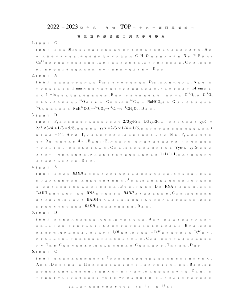 高三理综答案--河南省TOP二十名校2022-2023学年高三上学期调研模拟卷二