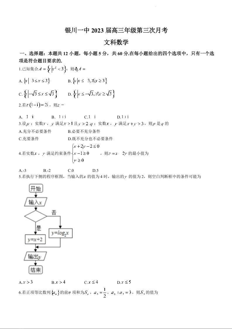 高三文数+答案--宁夏银川一中高三上学期第三次月考