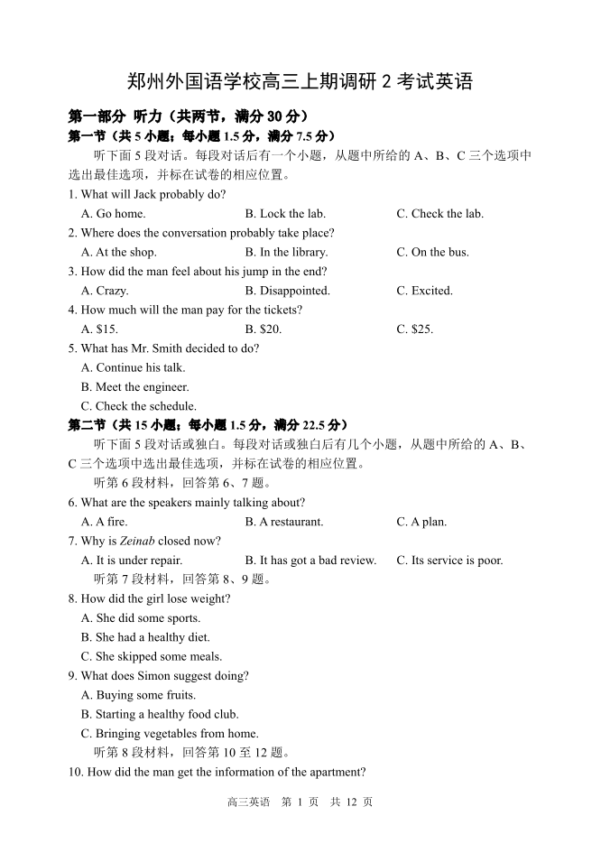 高三英语--河南省郑州市外国语学校2022-2023学年高三上学期12月月考