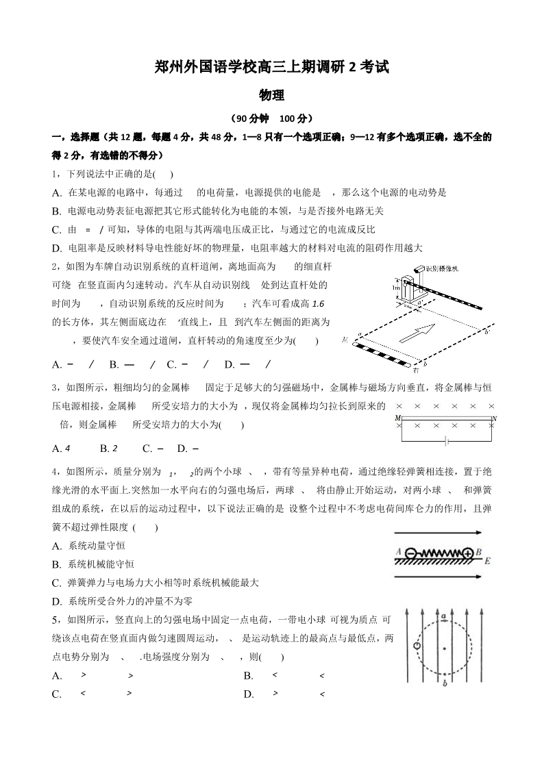 高三物理--河南省郑州市外国语学校2022-2023学年高三上学期12月月考