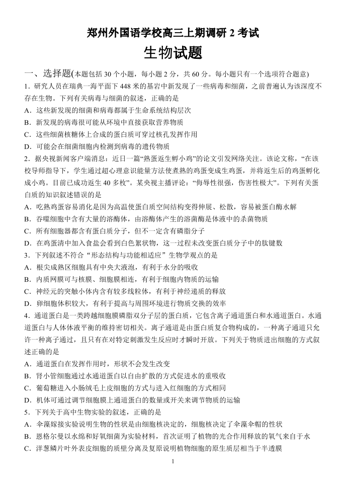 高三生物--河南省郑州市外国语学校2022-2023学年高三上学期12月月考