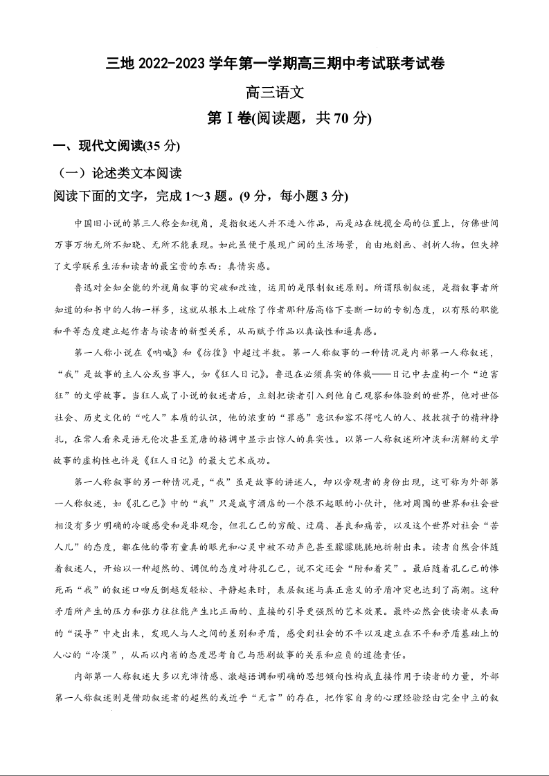 高三语文--甘肃省陇南、临夏、甘南三地2023高三上学期期中联考