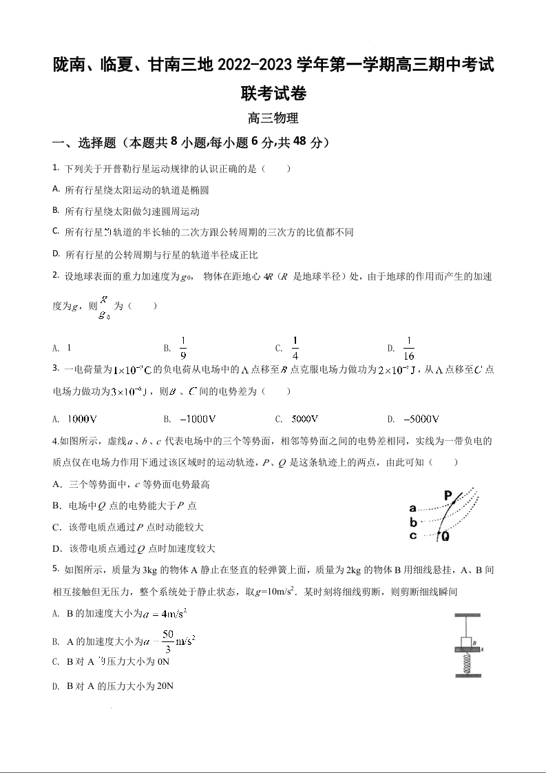 高三物理--甘肃省陇南、临夏、甘南三地2023高三上学期期中联考