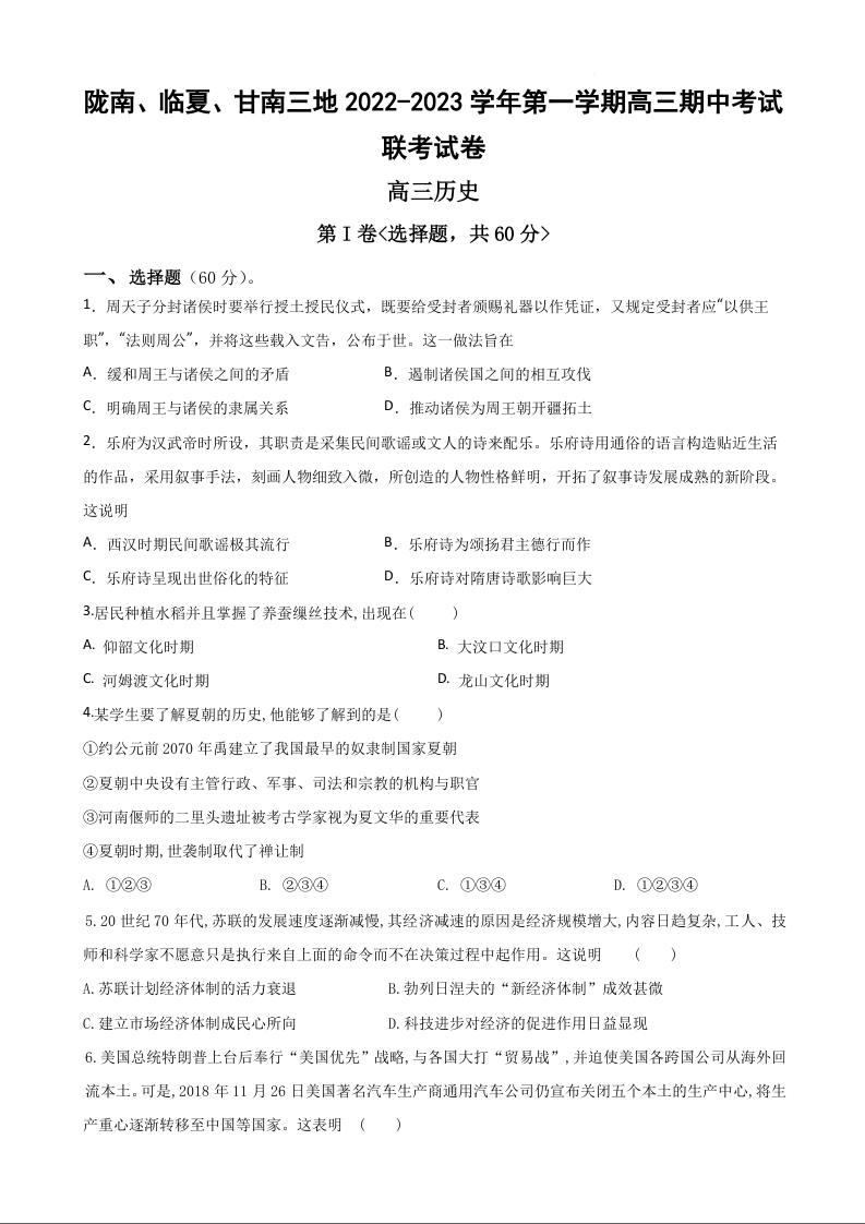 高三历史--甘肃省陇南、临夏、甘南三地2023高三上学期期中联考