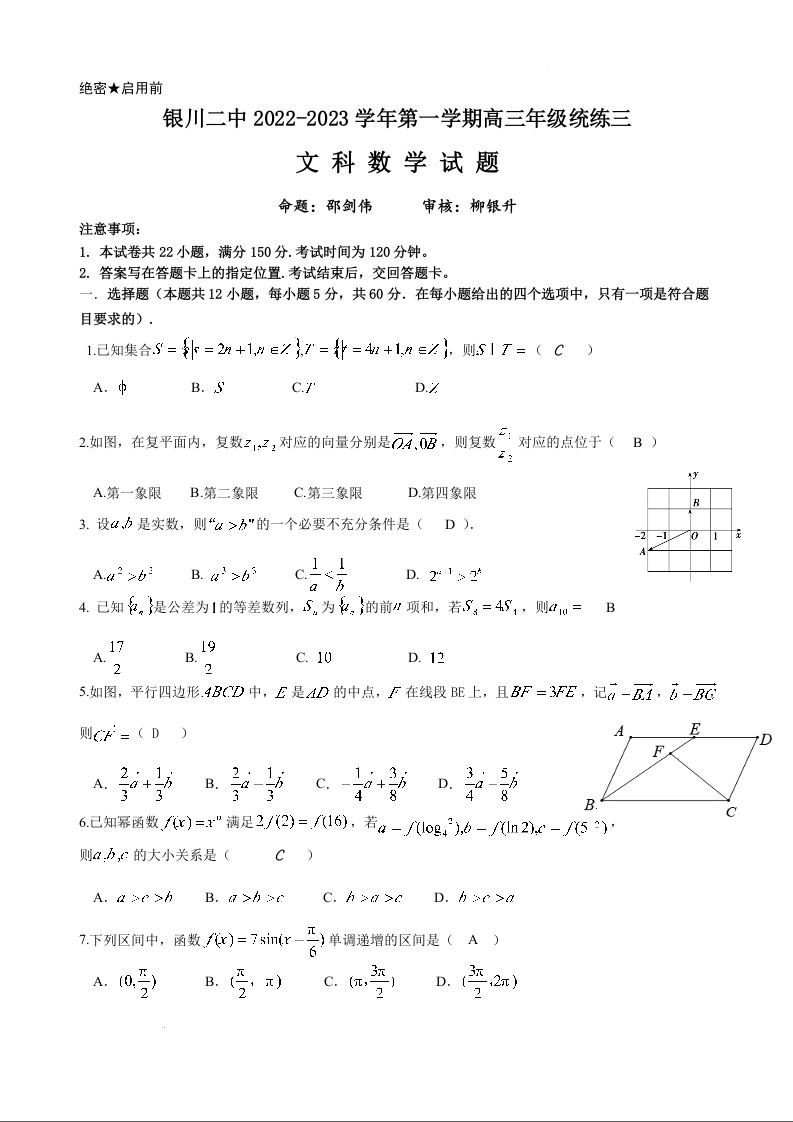高三文数答案--宁夏银川市第二中学高三上学期统练三