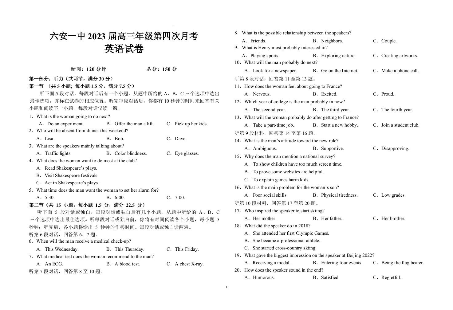 高三英语+答案--安徽省六安第一中学2023高三上学期第四次月考
