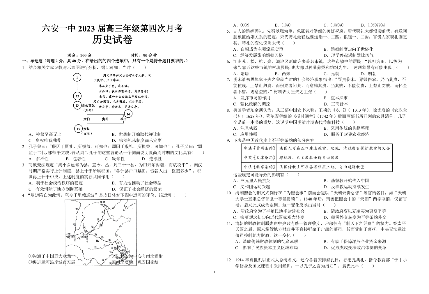 高三历史+答案--安徽省六安第一中学2023高三上学期第四次月考