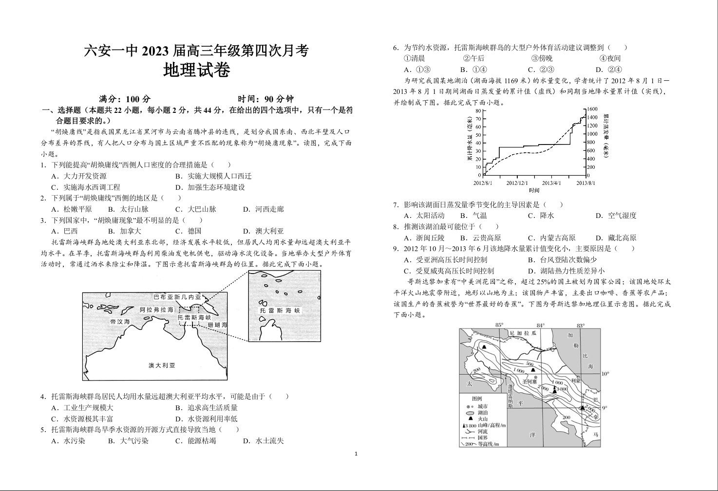 高三地理+答案--安徽省六安第一中学2023高三上学期第四次月考