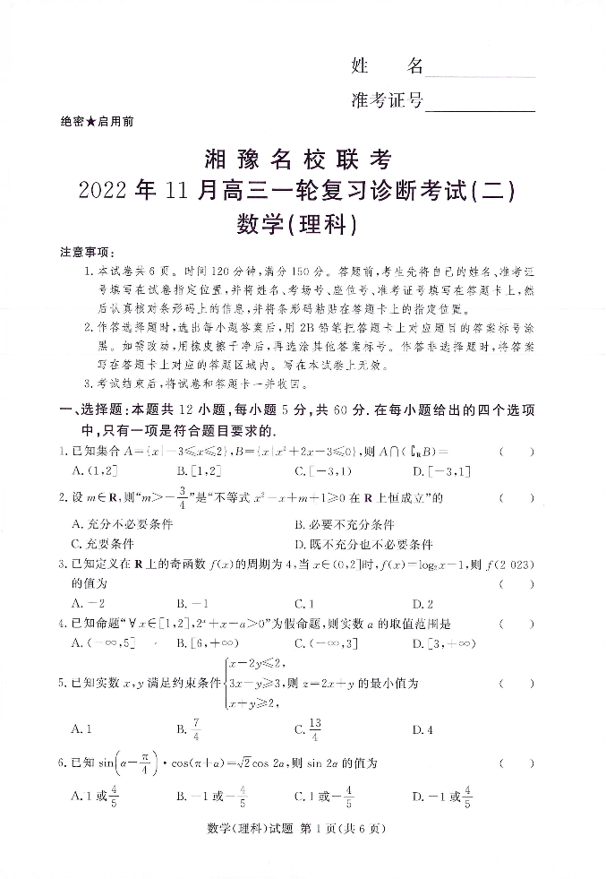 高三理数--湘豫名校联考高三上学期11月一轮复习诊断考试(二)