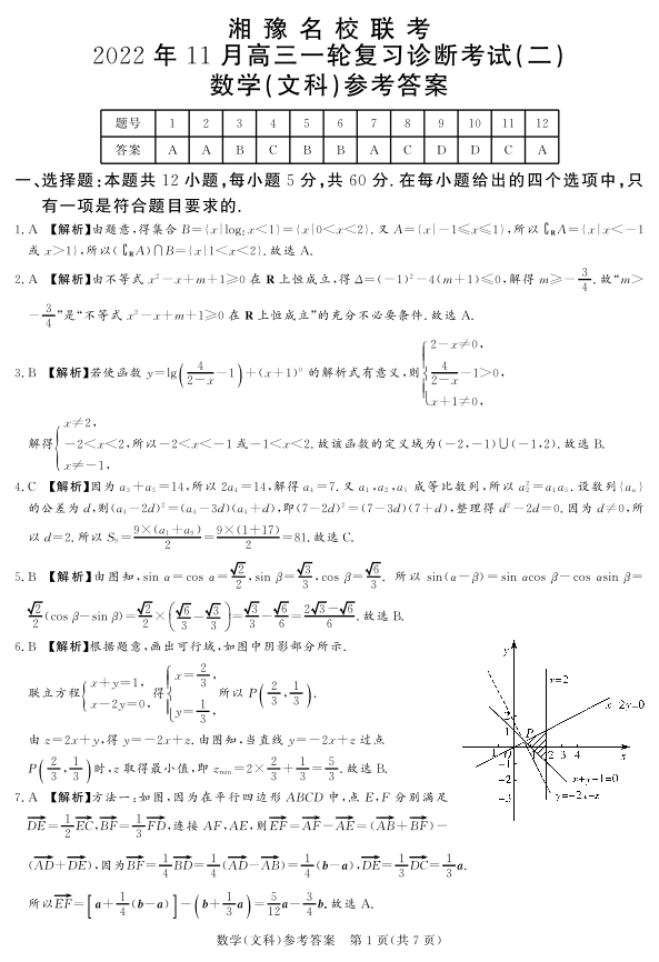 高三文数答案--湘豫名校联考高三上学期11月一轮复习诊断考试(二)