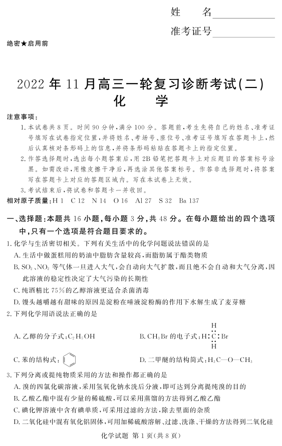 高三化学--湘豫名校联考高三上学期11月一轮复习诊断考试(二)