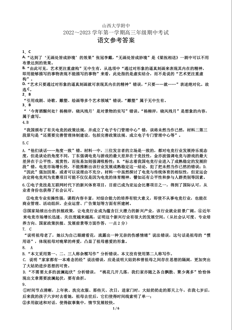 高三语文答案--山西大学附属中学校2023届高三上学期11月期中