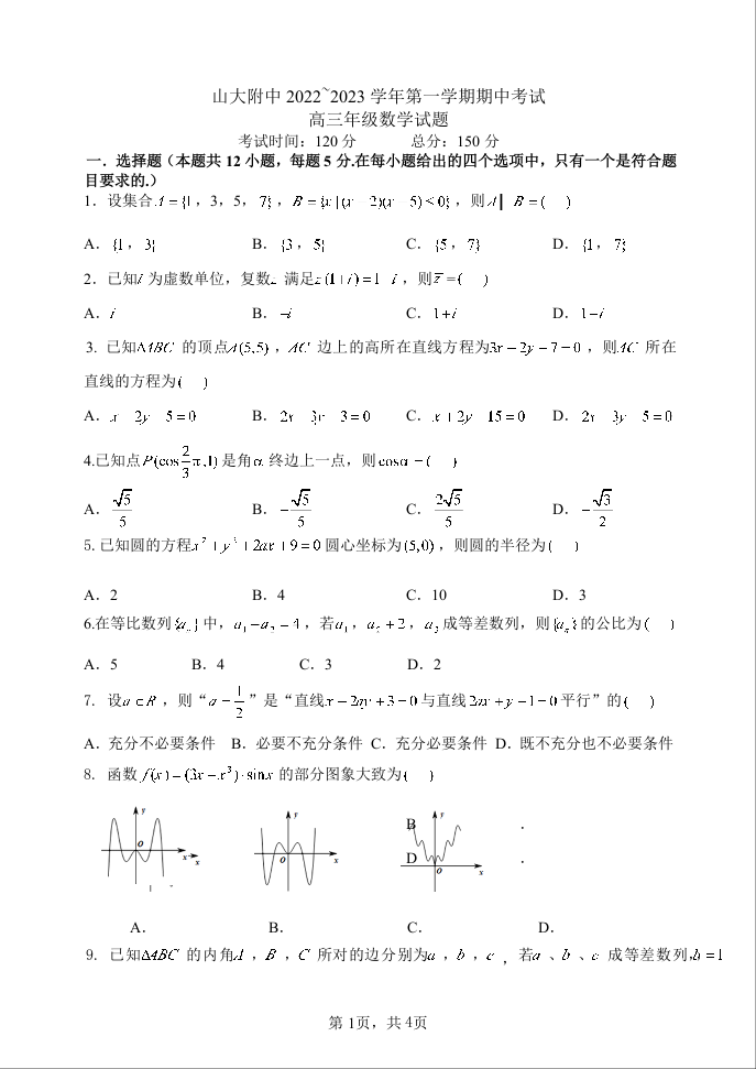 高三数学--山西大学附属中学校2023届高三上学期11月期中