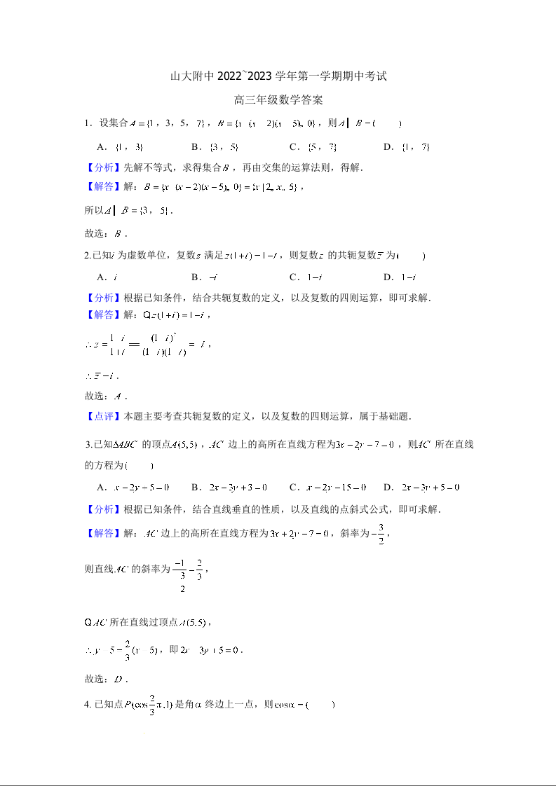 高三数学答案--山西大学附属中学校2023届高三上学期11月期中