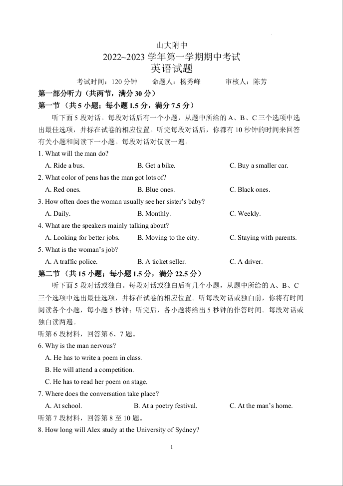 高三英语--山西大学附属中学校2023届高三上学期11月期中