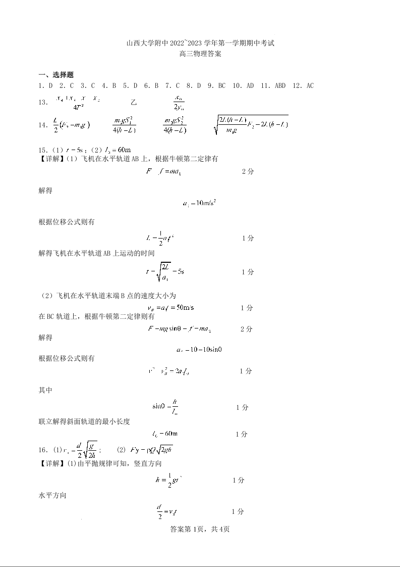 高三物理答案--山西大学附属中学校2023届高三上学期11月期中