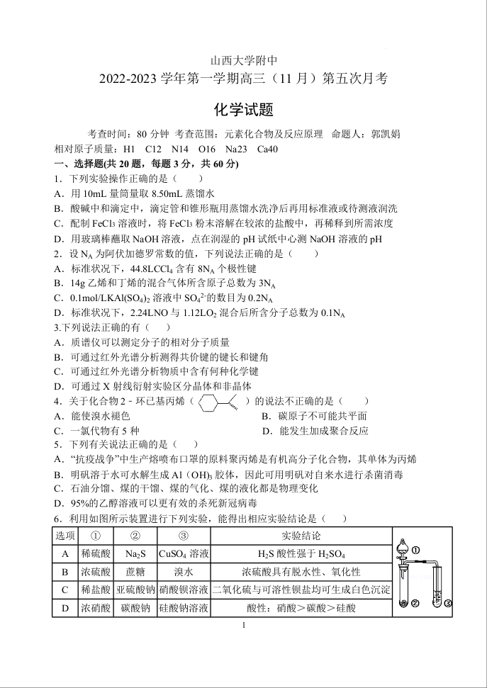 高三化学--山西大学附属中学校2023届高三上学期11月期中