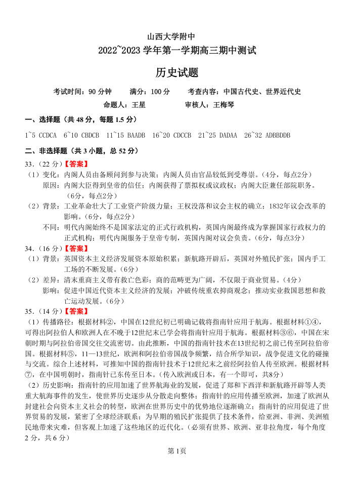 高三历史答案--山西大学附属中学校2023届高三上学期11月期中