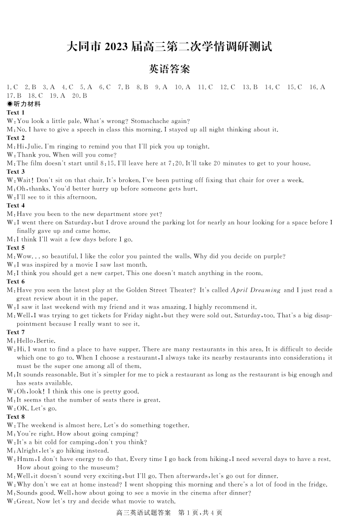 高三英语答案--山西省大同市高三上学期第二次学情调研测试(期中)