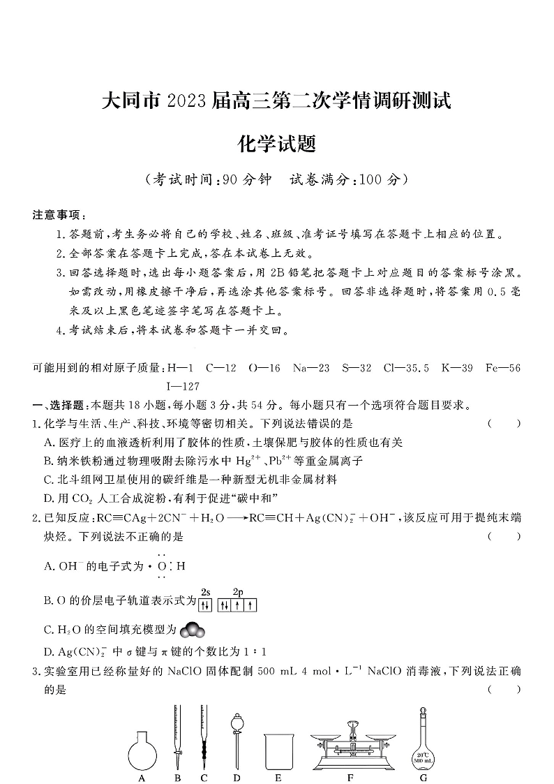 高三化学+答案--山西省大同市高三上学期第二次学情调研测试(期中)