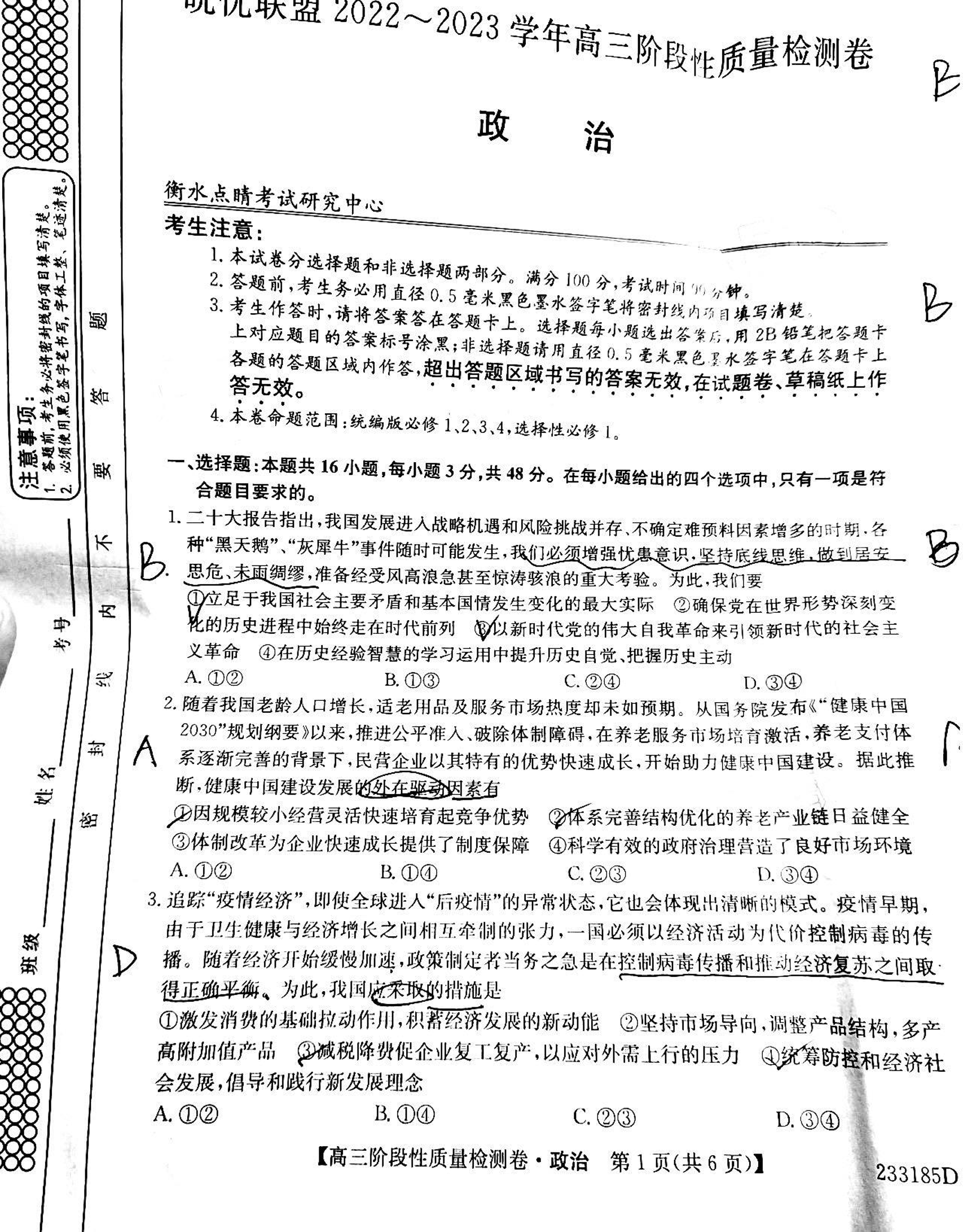 高三政治+答案--皖优名校联盟2022-2023高三阶段12月质量检测卷