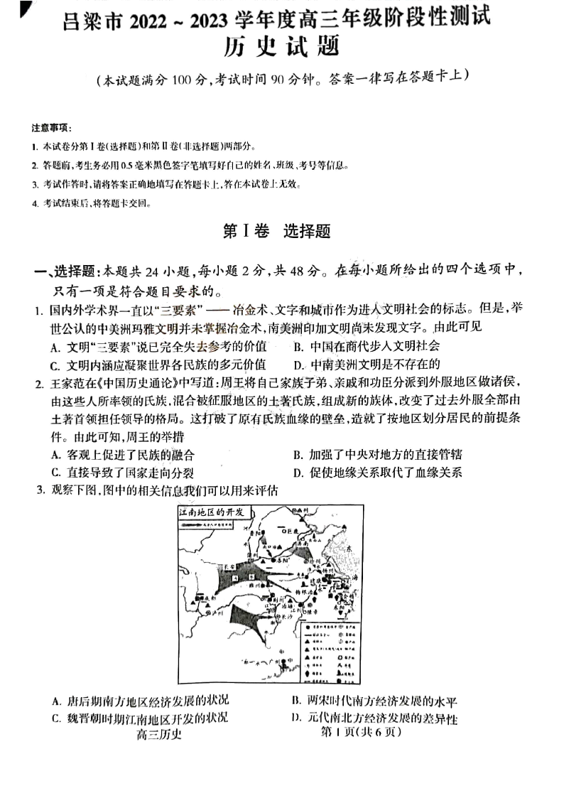 高三历史--山西省吕梁市2022-2023学年高三11月阶段性测试
