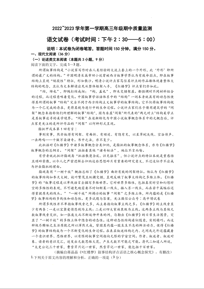 高三语文+答案--山西省太原市高三上学期期中质量监测