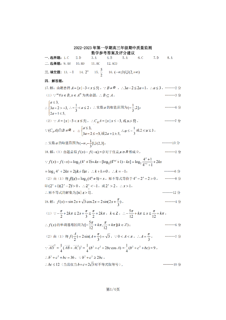 高三数学答案--山西省太原市高三上学期期中质量监测