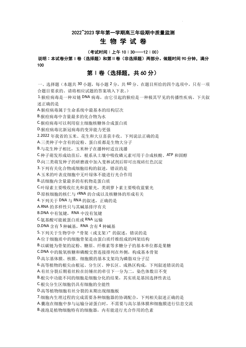 高三生物+答案--山西省太原市高三上学期期中质量监测