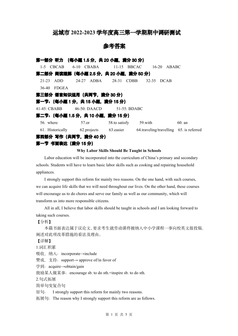 高三英语答案--山西省运城市2023届高三上学期11月期中调研测试