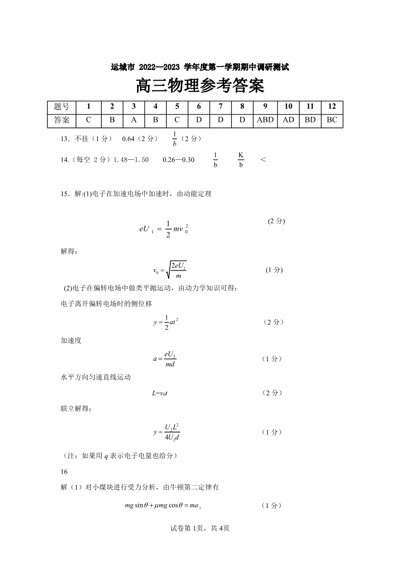 高三物理答案--山西省运城市2023届高三上学期11月期中调研测试