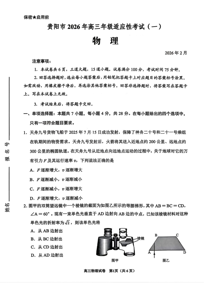 高三物理--贵州省贵阳市2026年高三年级2月适应性考试(一)