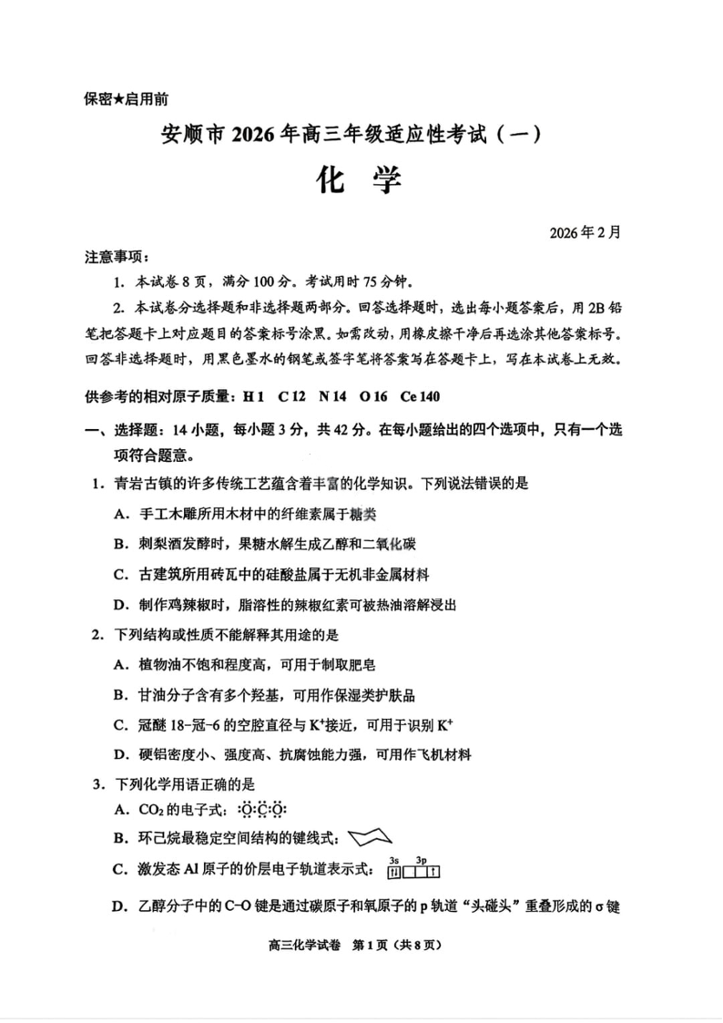 高三化学--贵州省贵阳市2026年高三年级2月适应性考试(一)