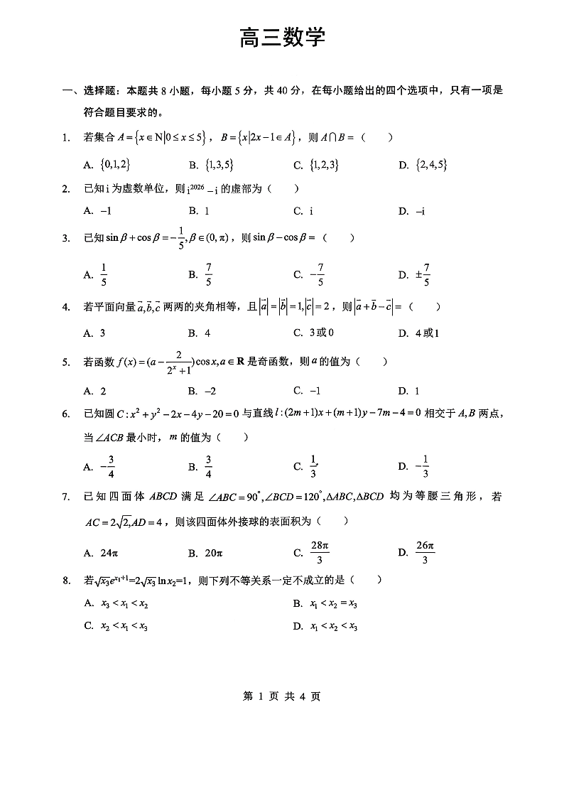 高三数学--湖北省新八校2026届高三下学期2月开学考试