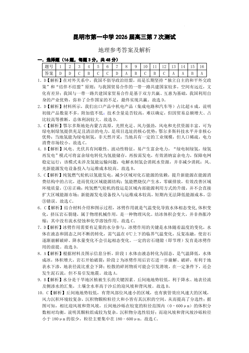 高三地理答案--云南省昆明市第一中学2026届高三2月复习诊断