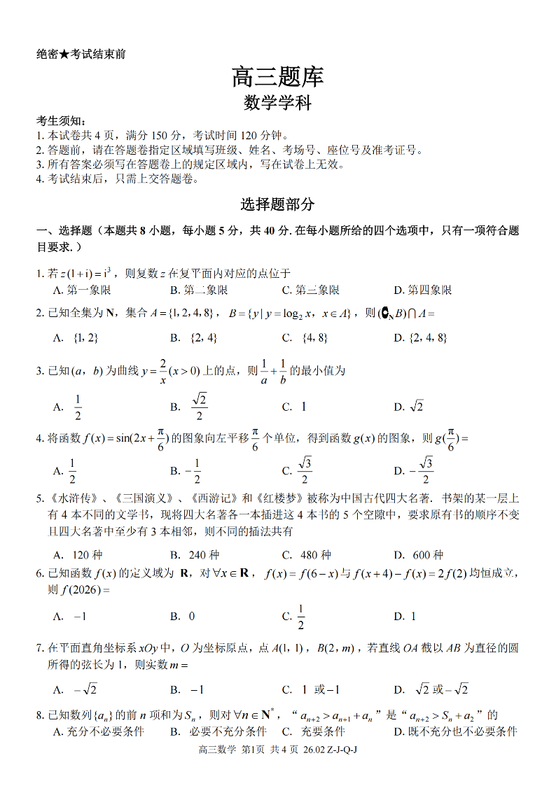 高三数学--浙江省2026届高三2月返校考七彩阳光、浙南名校、精诚联盟、金兰教育