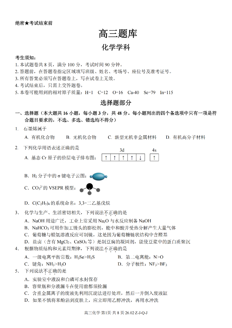 高三化学--浙江省2026届高三2月返校考七彩阳光、浙南名校、精诚联盟、金兰教育
