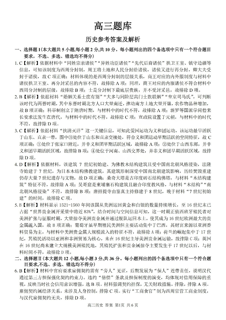 高三历史答案--浙江省2026届高三2月返校考七彩阳光、浙南名校、精诚联盟、金兰教育