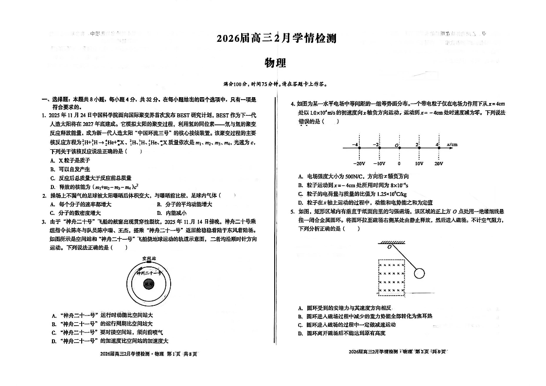 高三物理--安徽省A10联盟2026届高三2月开年考