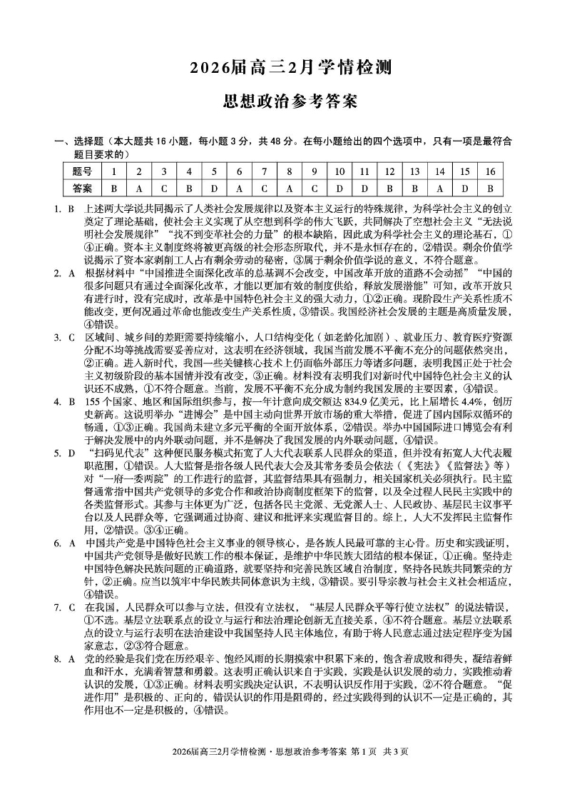 高三政治答案--安徽省A10联盟2026届高三2月开年考