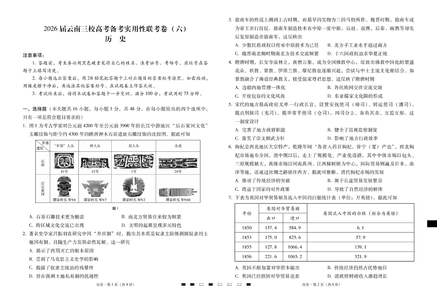 高三历史--云南2026届三校高考备考实用性联考卷(六)