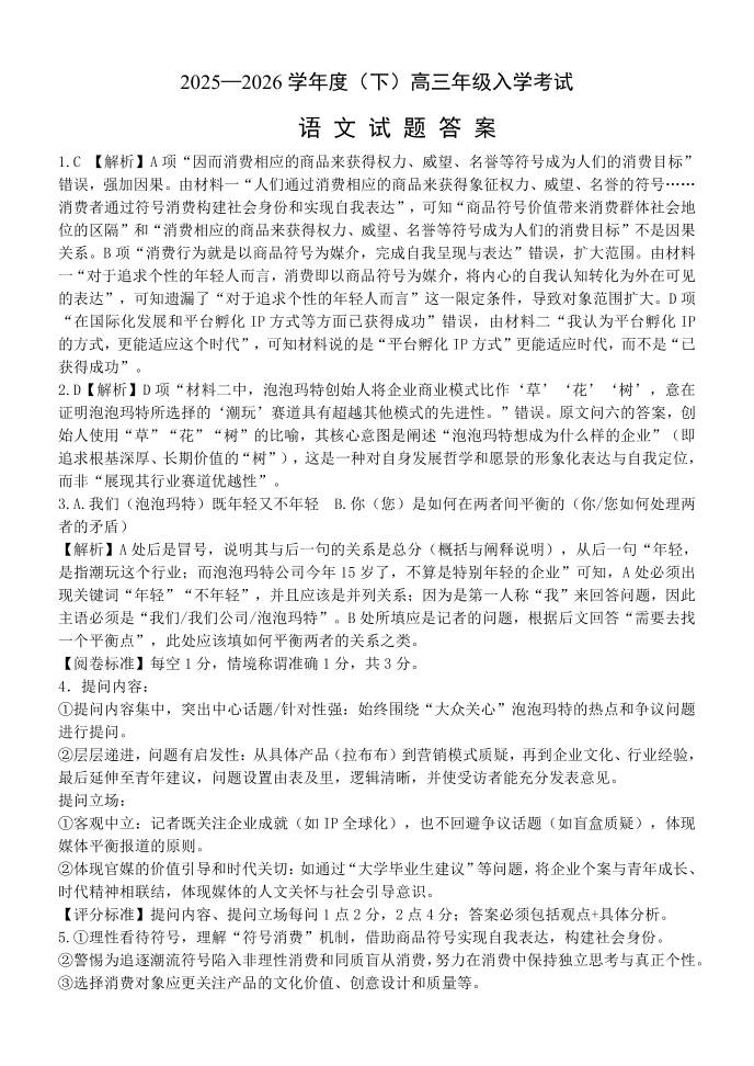 高三语文答案--重庆市第八中学2026届高三下学期入学考试