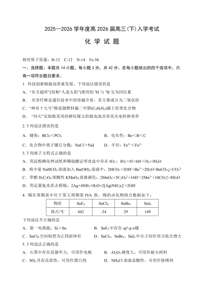 高三化学--重庆市第八中学2026届高三下学期入学考试