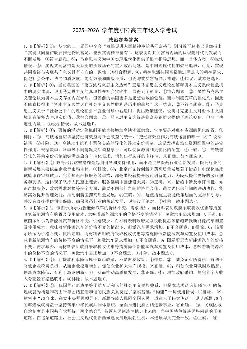 高三政治答案--重庆市第八中学2026届高三下学期入学考试