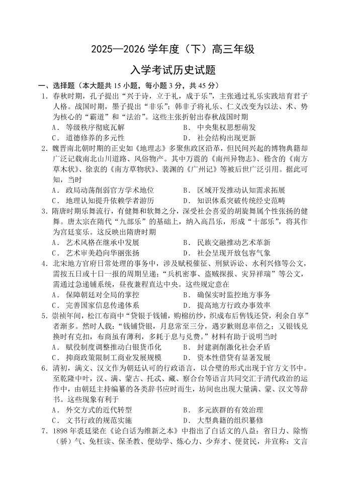 高三历史--重庆市第八中学2026届高三下学期入学考试